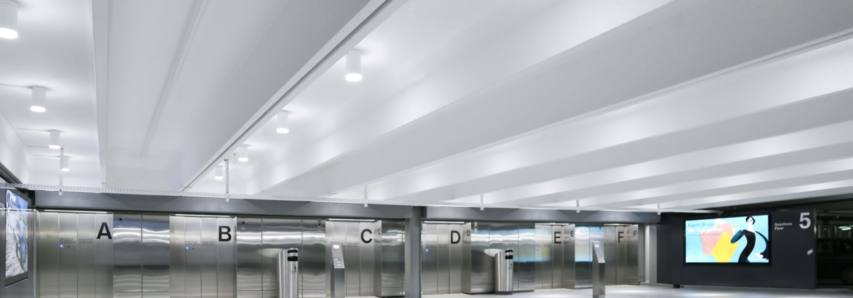 Das Parkhaus ist Dreh- und Angelpunkt des Flughafens in Zürich. Es war daher zentral, dass bereits bei der Anreise eine angenehme Stimmung herrscht. Das Parkhaus in neuem Glanz erstrahlen lassen und die Reisenden sicher zum Eingang bringen, das war die grosse Herausforderung. Durch die einzigartige Glaskonstruktion wird nebst der punktuellen Beleuchtung am Boden auch eine indirekte Deckenaufhellung erzielt. Dies lässt den Raum höher und kundenfreundlicher wirken. Um den Installationsaufwand möglichst kurz zu halten, wurde ein einfacher Dreh-/Klickverschluss konstruiert.